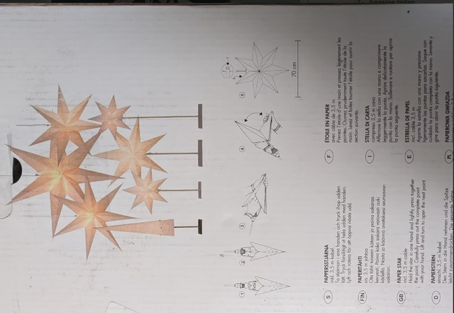 Deko-Papierstern zur Innenbeleuchtung. Wird aufgehängt und mit einer E14-Fassung betrieben. Lampenfassung und 3,5 m Kabel im Lieferumfang enthalten. Leuchtmittel nicht enthalten.